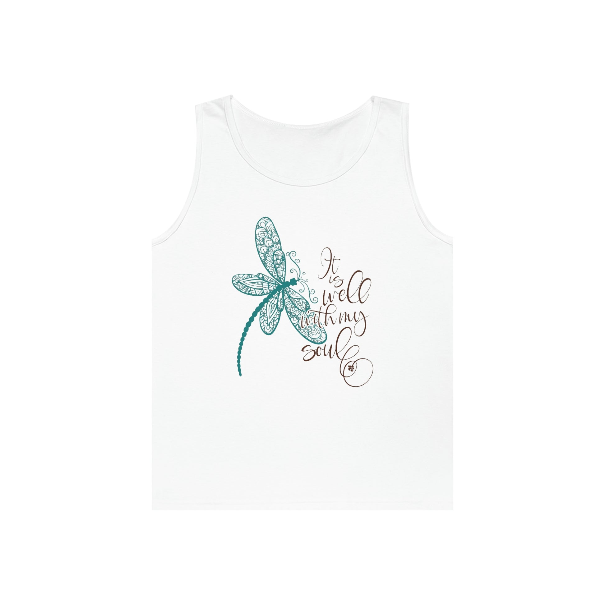 This tank top with a dragonfly and motivational words features a colorful and detailed image of a dragonfly, with its delicate wings spread wide, printed on the front of a Gildan, Unisex tank top. Surrounding the dragonfly, there is the inspirational phrase, "It Is Well With My Soul", that encourage the wearer to stay strong, persevere through challenges, and embrace their inner strength.