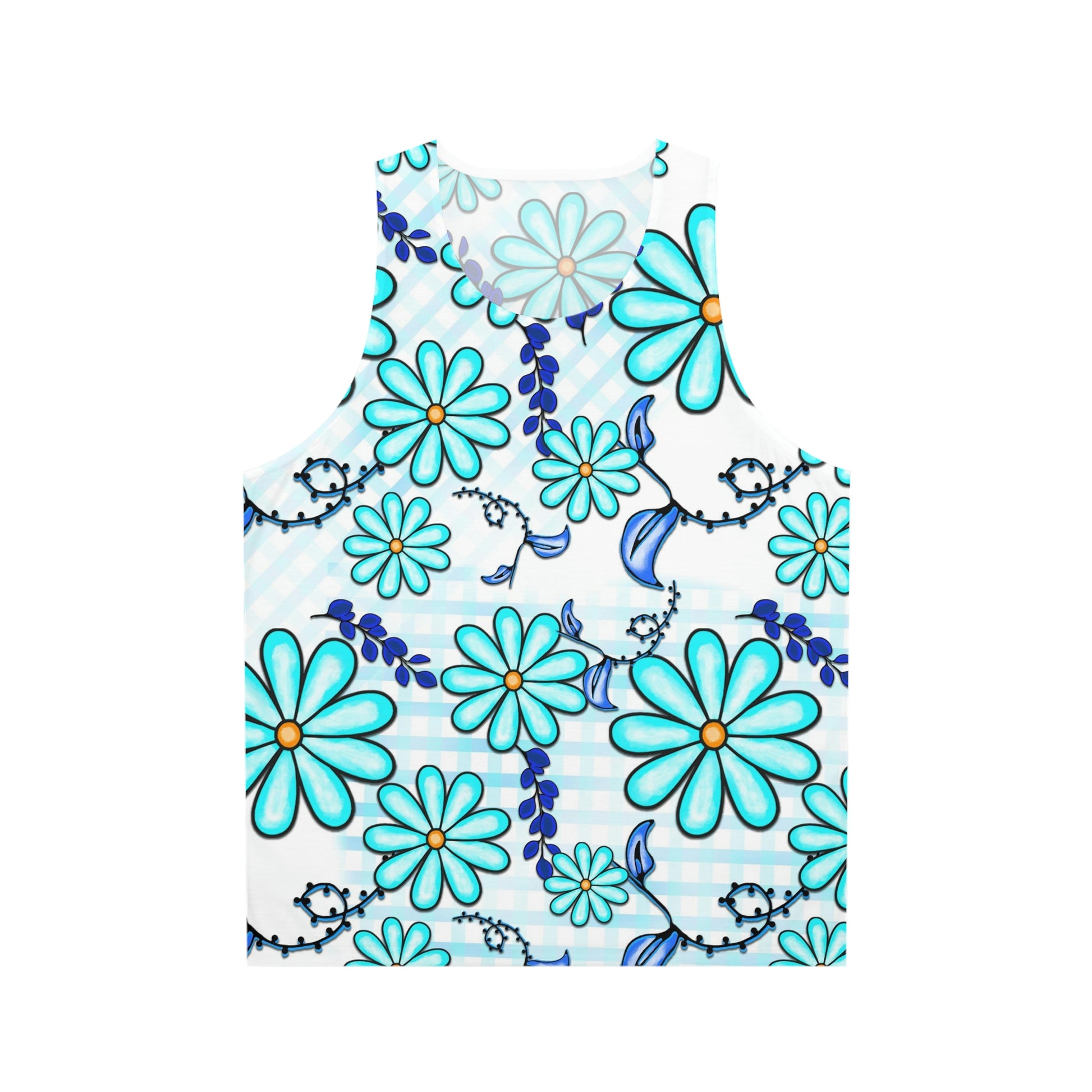 Our Blue Floral Daisy Unisex Style Tank Top a sleeveless shirt made from lightweight fabric and features a white background adorned with a charming daisy flower print. The design of the tank top typically includes a scoop neckline and thin shoulder straps that provide a comfortable fit and freedom of movement.